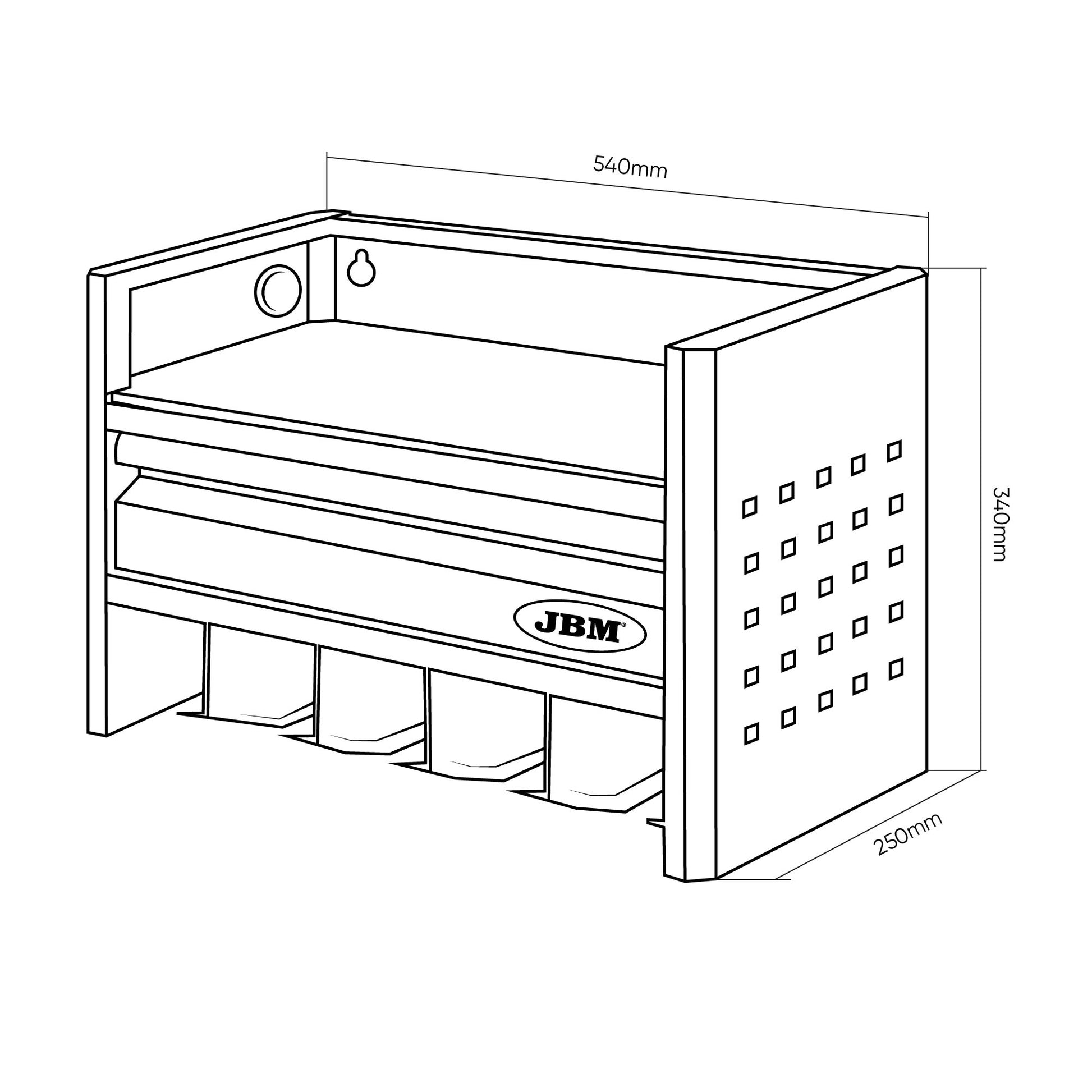 · Integrerte holdere for opptil 5 JBM elektriske verktøy, med fast og sikker passform.