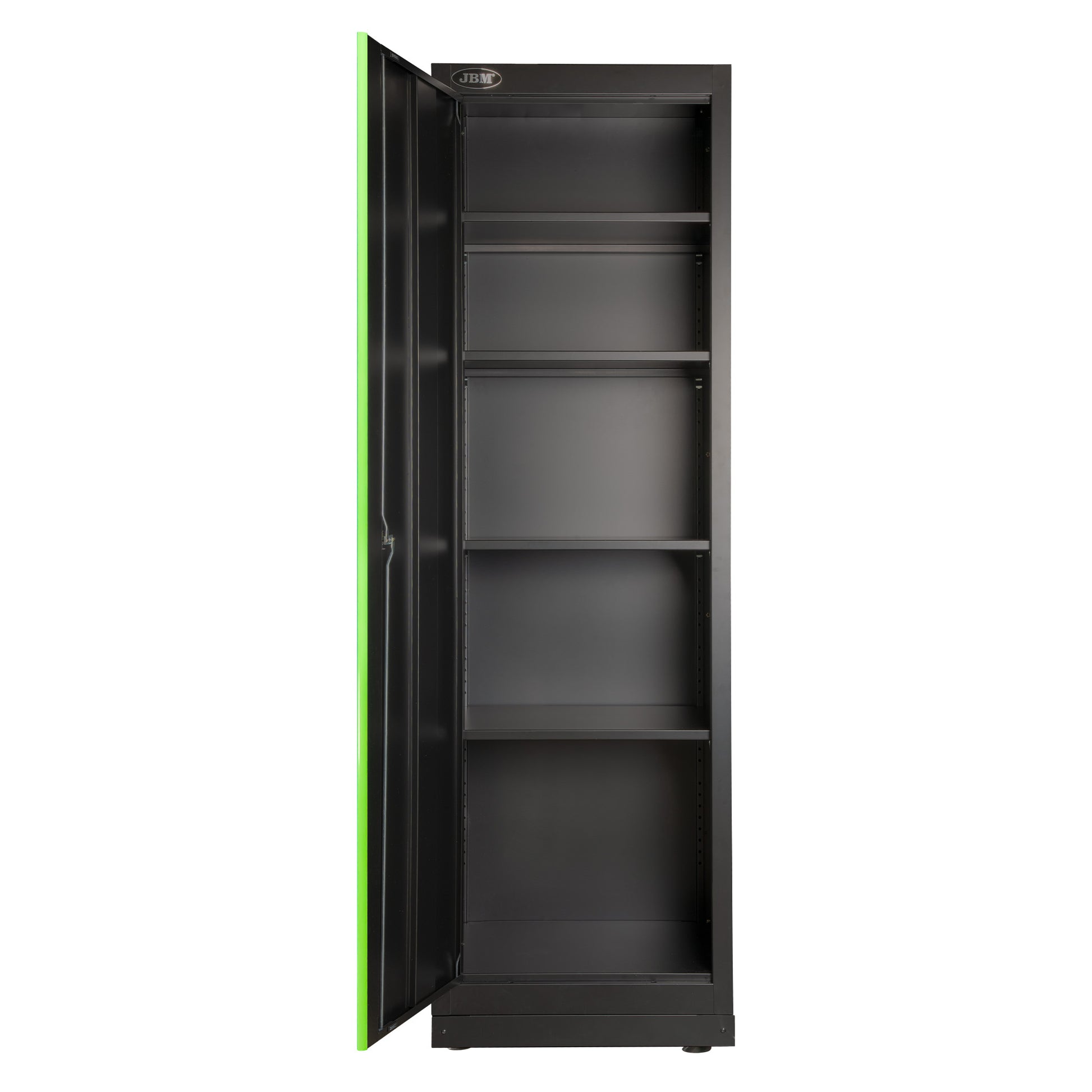 Høyt skap designet med høydejusterbare ben, låsesylinder og innvendige brett. Den allsidige strukturen gjør at den kan brukes som hyller eller vertikal lagringsplass for verktøy, forsyninger og tilbehør som krever større kapasitet.